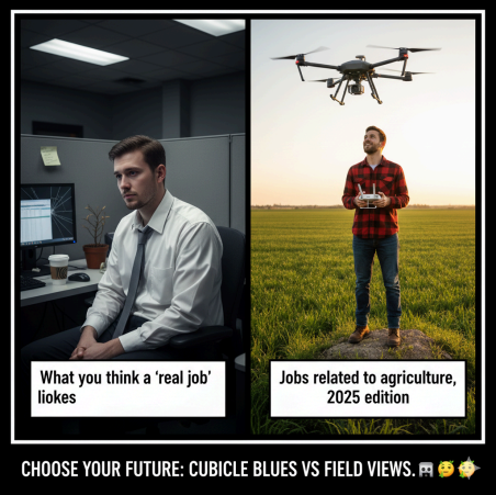 Somebody fed you a lie that jobs related to agriculture are just “old dudes on tractors growing corn in the middle of nowhere.” Meanwhile you’re in a windowless WeWork, chugging burnt coffee, writing emails like “just circling back :)” while your vitamin D levels file for divorce.