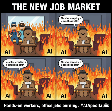 If you can conduct your whole job in a browser tab while sitting still in a hoodie? Yeah, maybe you should learn a trade, how to deal with people, or something that has electricity. In any case, I “wish you the best” in the job market of 2025 and beyond, which is not scary at all. Choose a lane: tools, tears, toddlers, or tattoos. The robots can’t do everything.